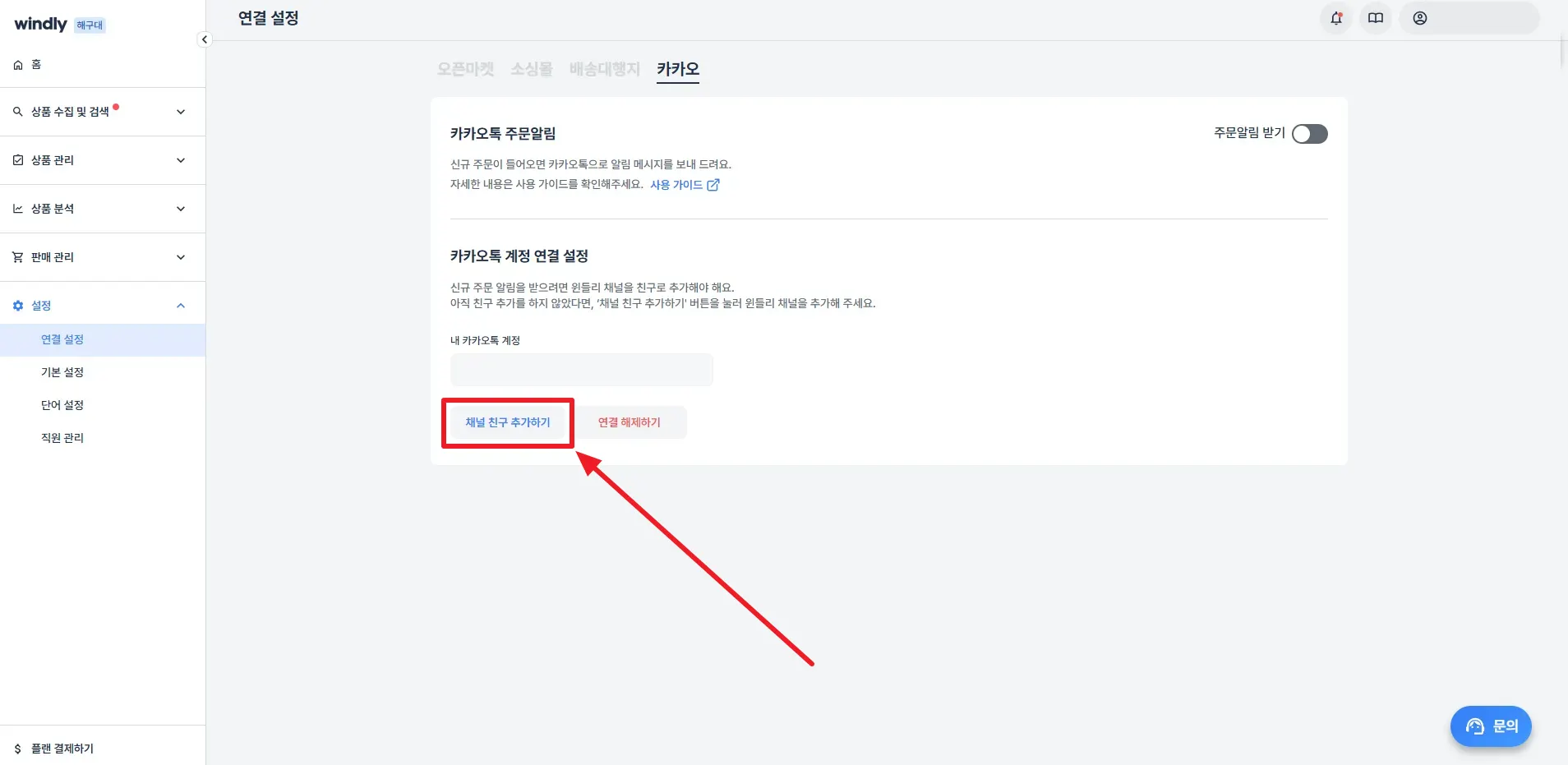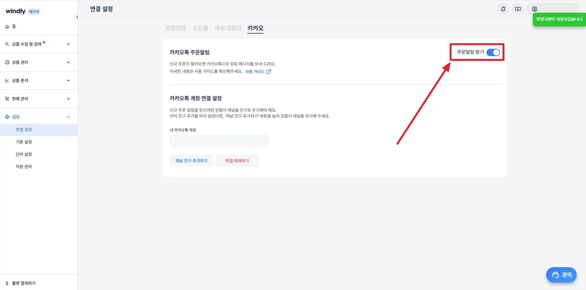 카카오톡 신규주문 알림을 받기 위해서는, 윈들리에서 카카오톡 계정을 먼저 연결해야 해요.