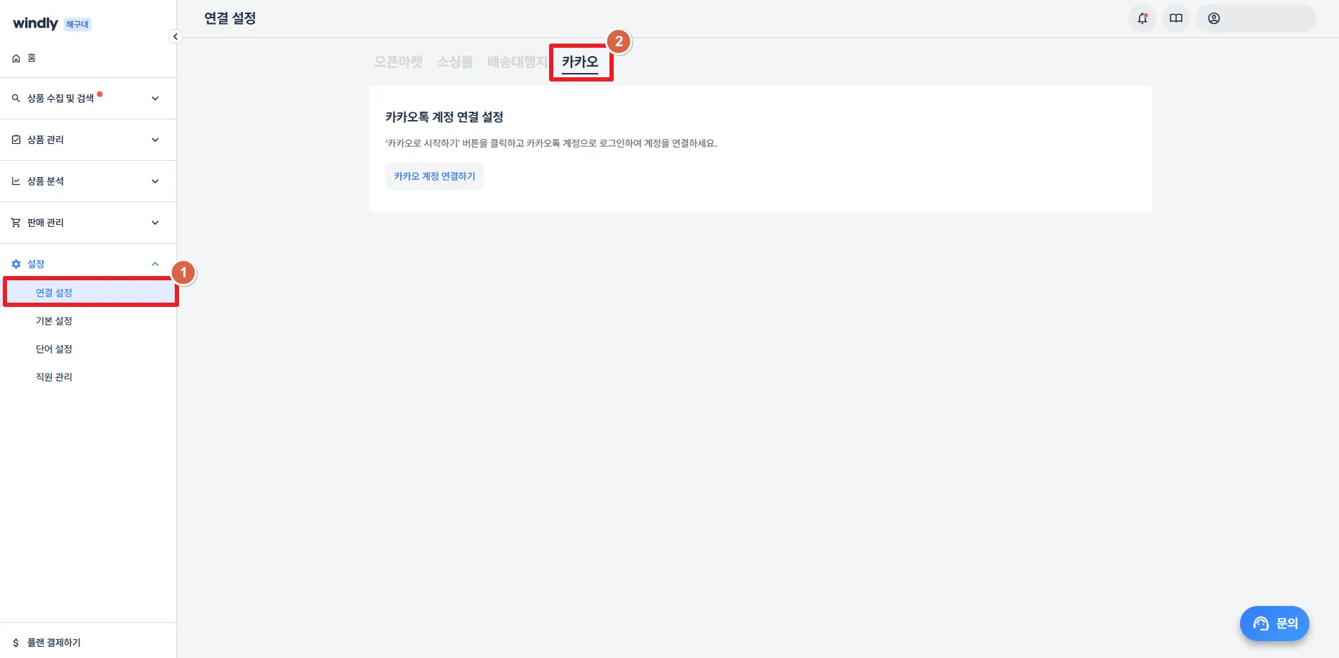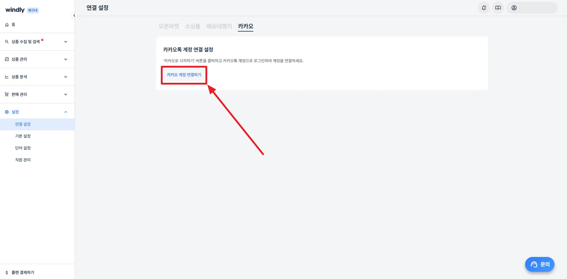 윈들리 좌측 메뉴 ‘설정’ - 연결 설정 - 카카오로 접속해 주세요.