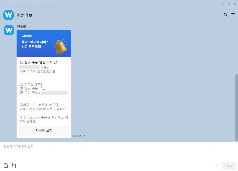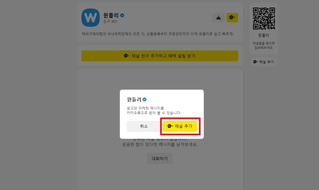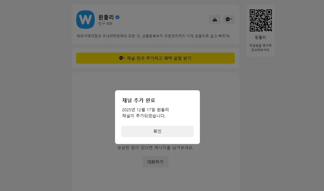 카카오톡 신규주문 알림을 받기 위해, 윈들리 채널을 카카오톡 친구로 추가해 주세요.