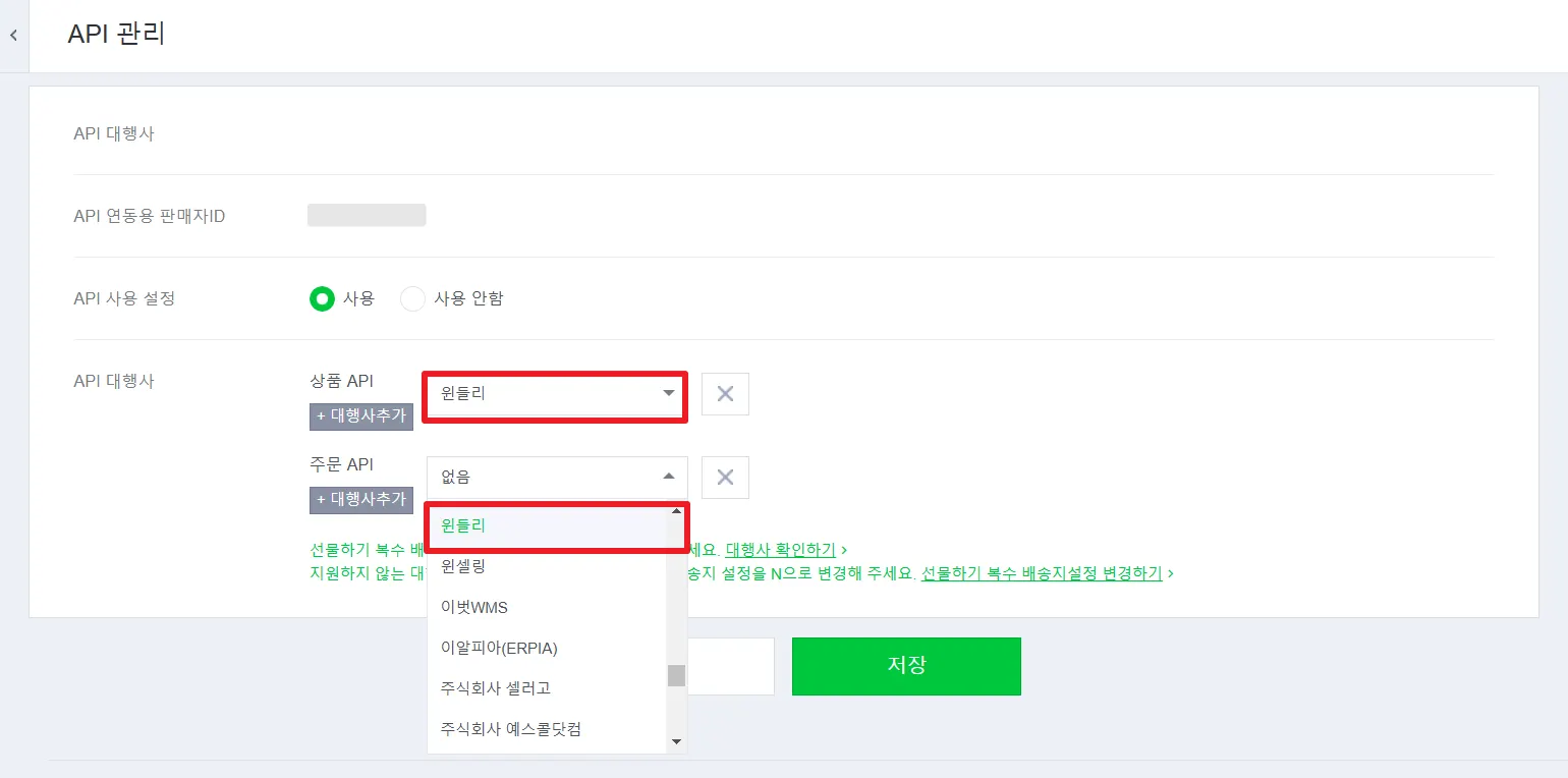 따라서 이후 윈들리에서 주문을 확인하고 송장번호를 입력하지 않을 예정일 때에도, 상품 API와 주문 API를 모두 윈들리로 설정해 주세요.