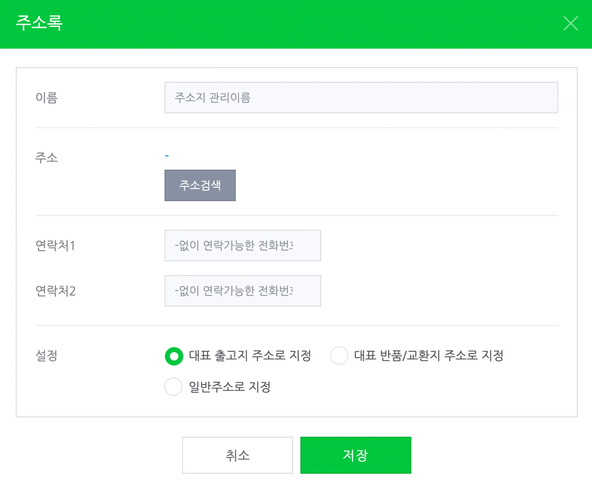출고지 주소를 입력해 주세요. 주소는 국내 주소지로 입력 후 대표 출고지 주소로 지정 선택한 뒤 저장해 주세요.
