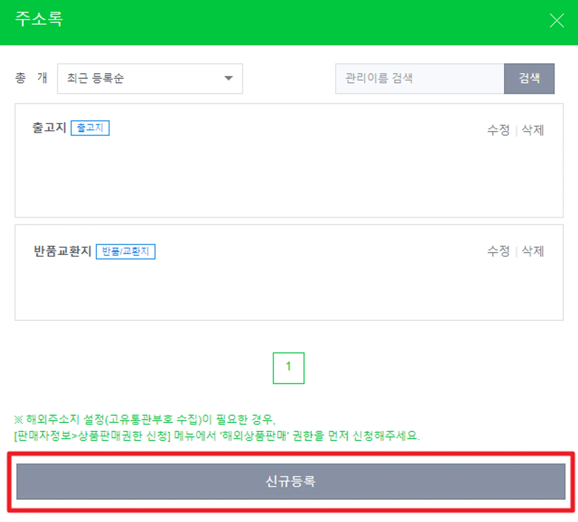 다시 한 번 신규등록 버튼을 누른 후 반품/교환지 주소를 입력한 후 저장해 주세요.