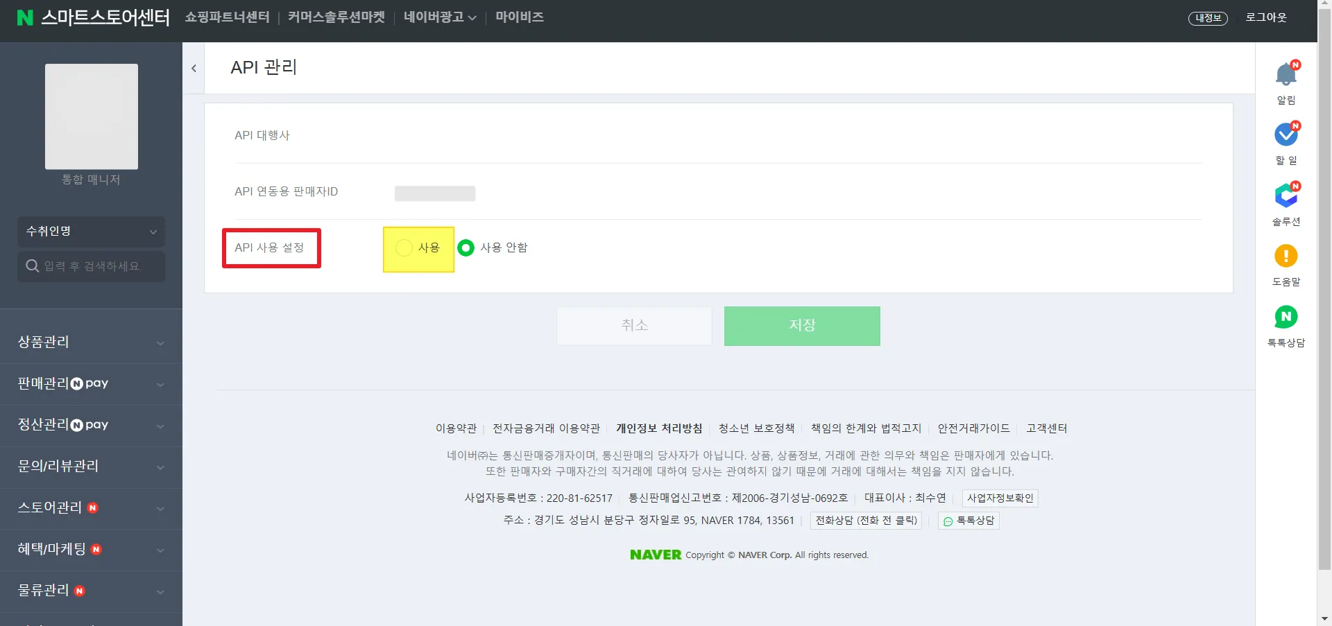 ※ 연동에 실패하는 경우 여기 내용에 따라 API 연동용 판매자ID 설정을 올바르게 진행 하였는지, ‘ncp_’로 시작하는 API 연동용 판매자ID를 올바르게 입력한 것이 맞는지 다시 한 번 확인해주세요.