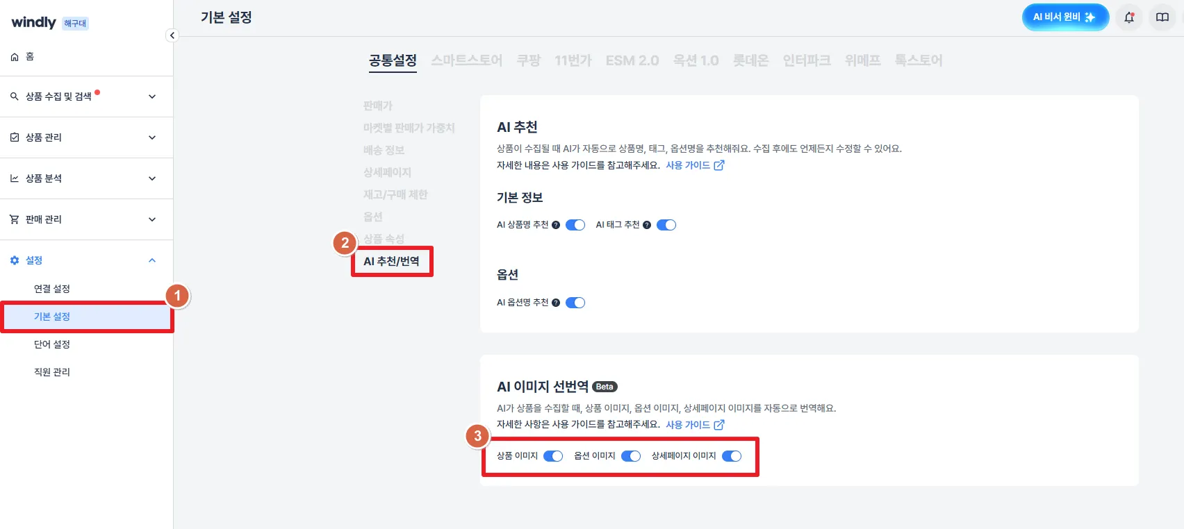 (메뉴 위치: 윈들리 화면 좌측 '설정' - 기본설정 - 공통설정 - AI 추천/번역)