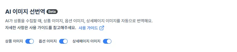 AI 이미지 선번역 기능 사용을 원한다면, 상품 수집 전 관련 설정 버튼을 미리 켜 주세요.