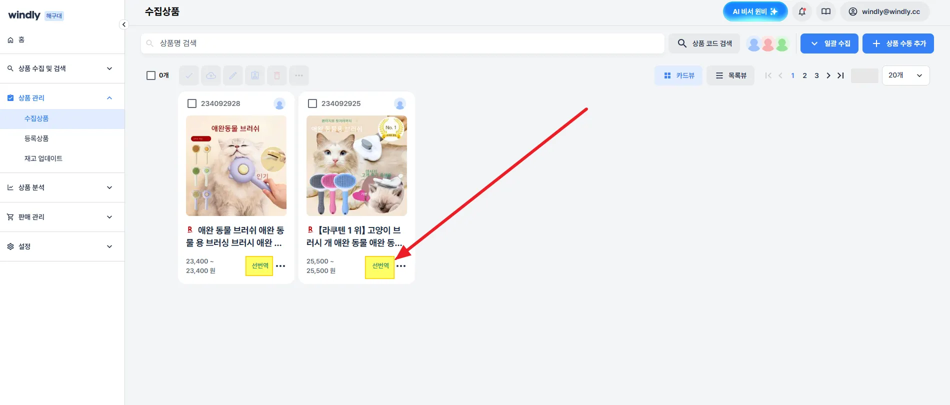 소싱몰 검색/카테고리 페이지에서, 상품별 썸네일에 표시되는 윈들리 추가 버튼 클릭