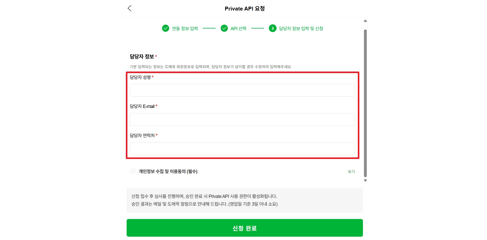 ‘개인정보 수집 및 이용동의’ 영역에 체크하고, ‘신청 완료’ 버튼을 클릭해 주세요.