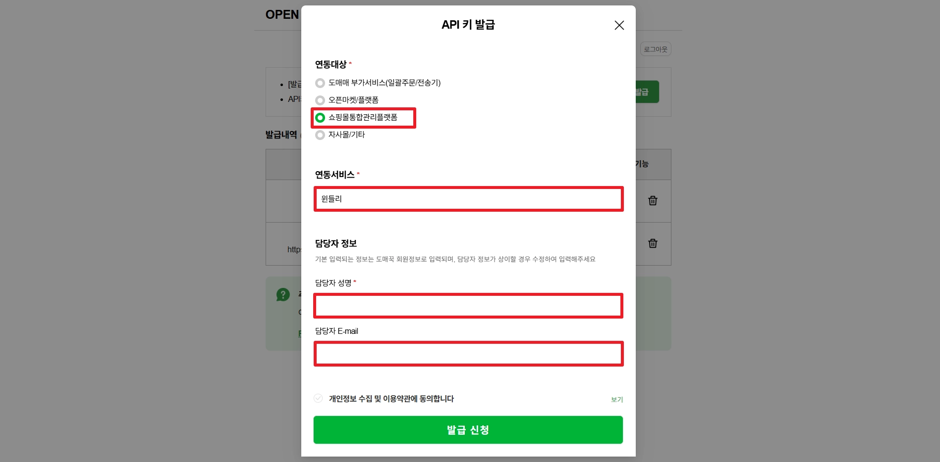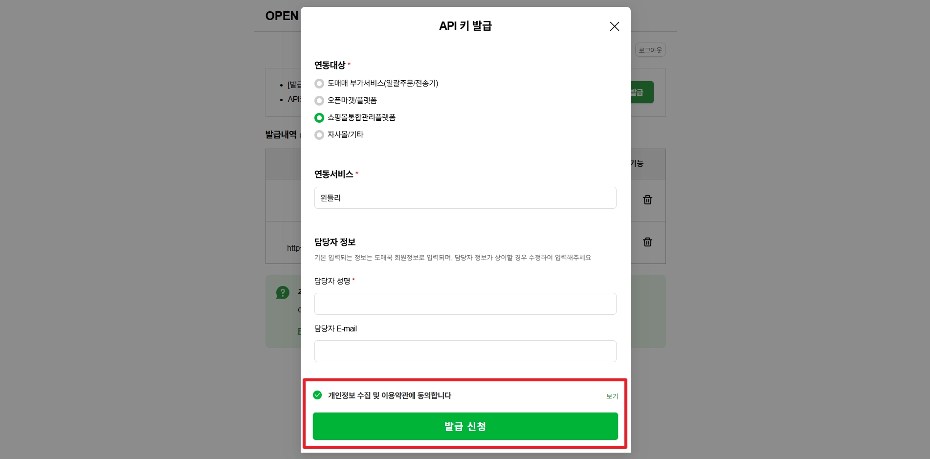 도매꾹 측의 API 키 승인이 완료되었다면, 해당 API 키를 윈들리에 연결해 주세요.