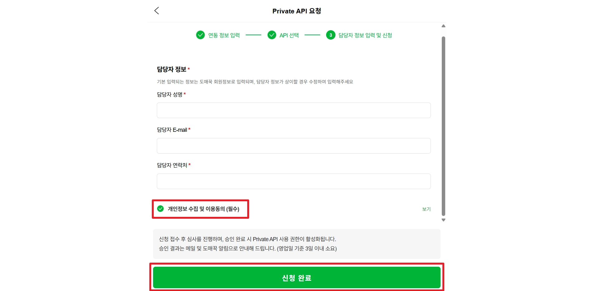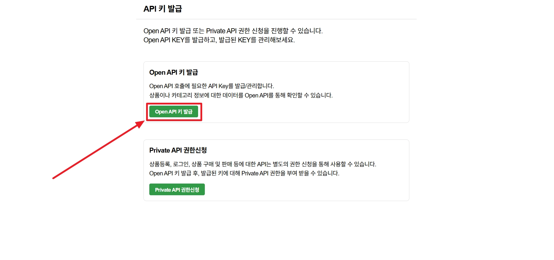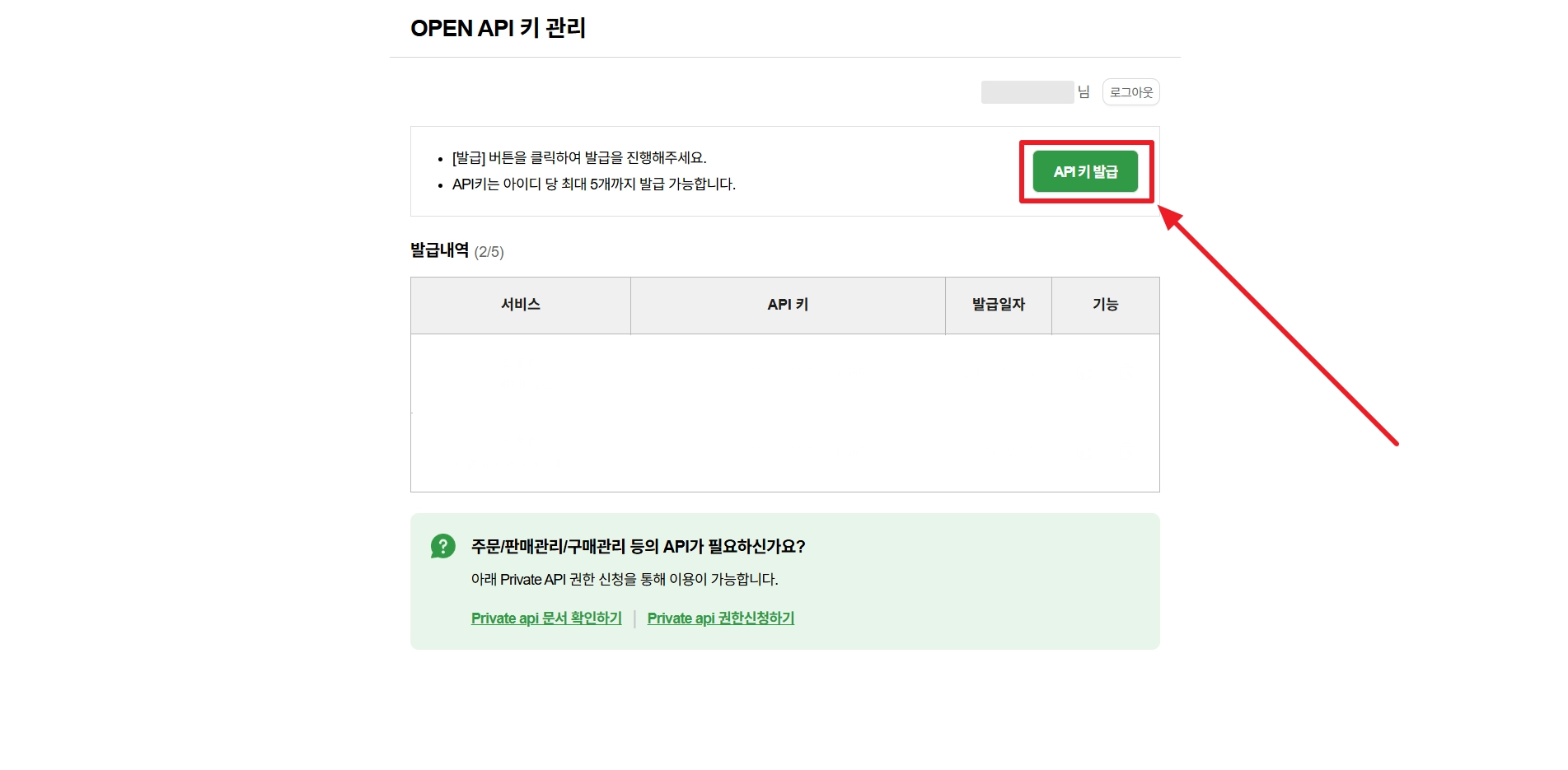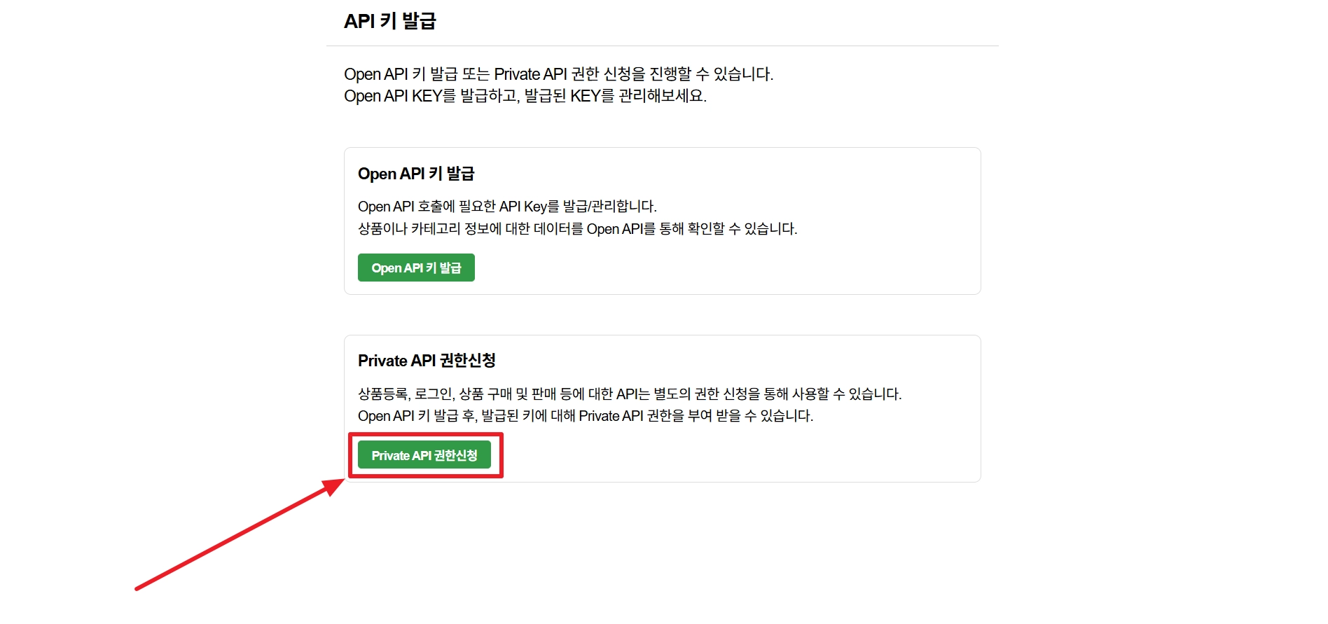 ‘Private API 권한신청’ 버튼을 클릭해 주세요.