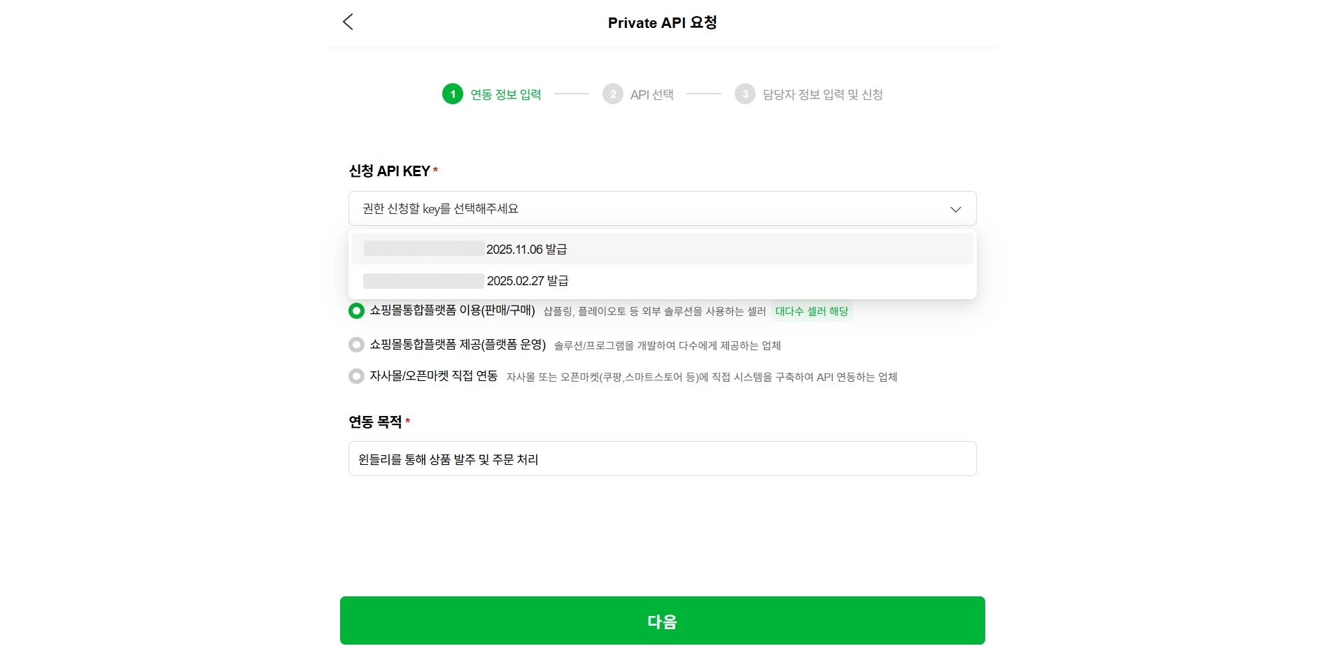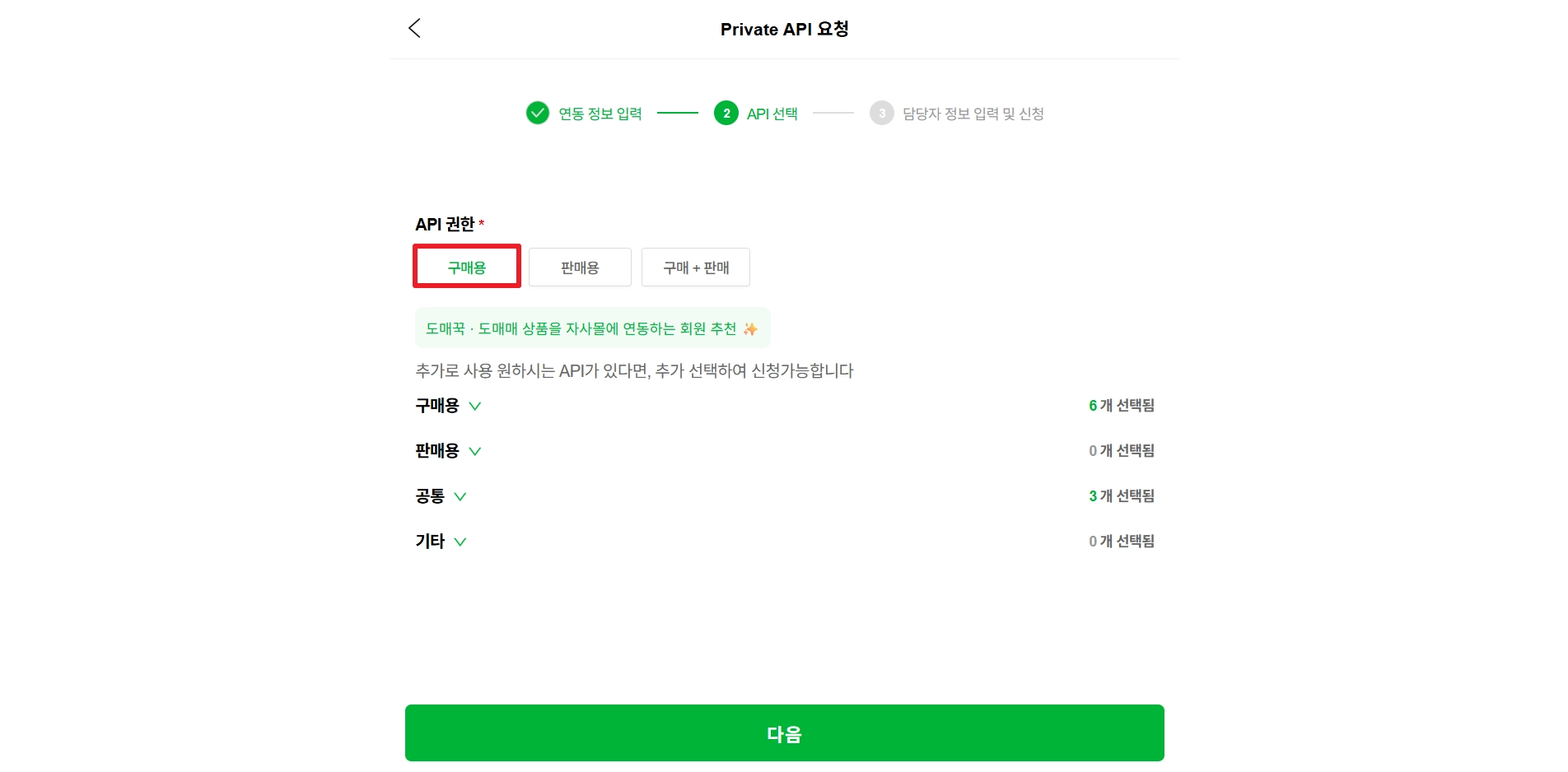 ‘API 선택’ 페이지에서 API 권한을 구매용 으로 선택한 뒤, ‘다음’ 버튼을 클릭해 주세요.