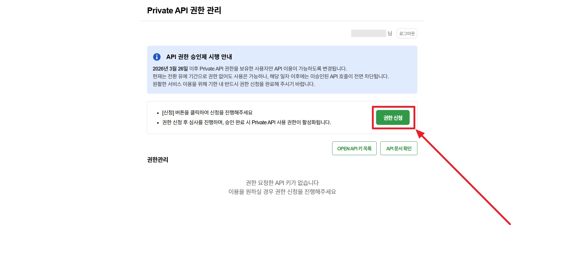 Open API 키가 발급된 이후, 아래와 같이 권한을 신청해 주세요.