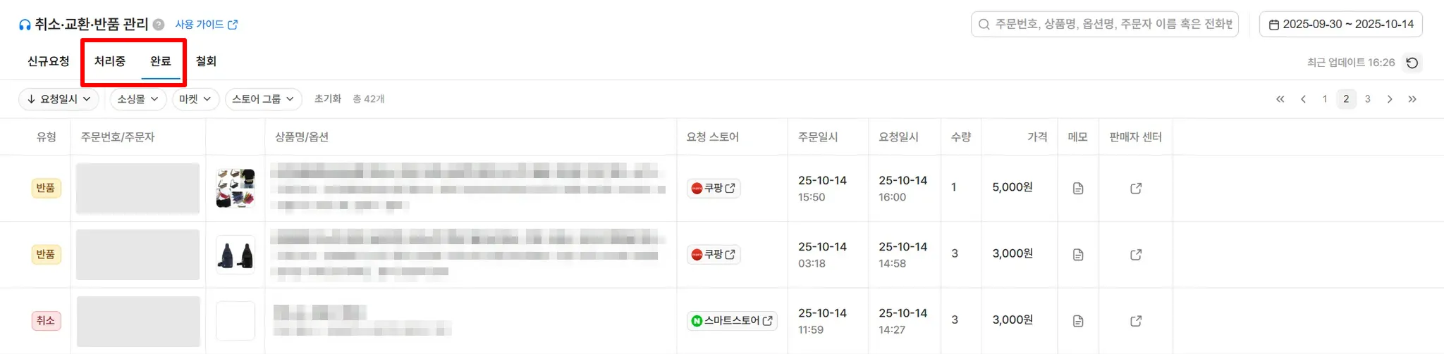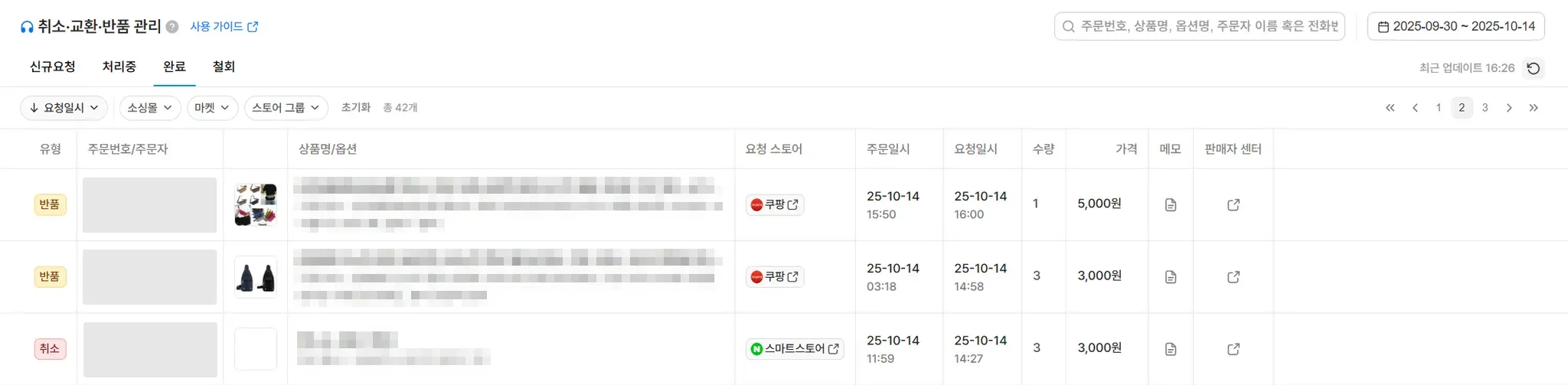 완료 탭: 처리가 완료된 취소/교환/반품 요청 건이 나타나요.