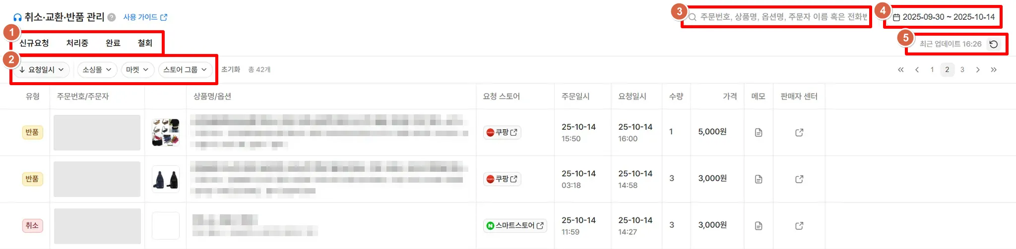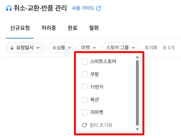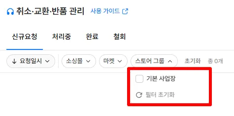 신규요청 탭: 새로운 취소/교환/반품 요청 건이 나타나요,