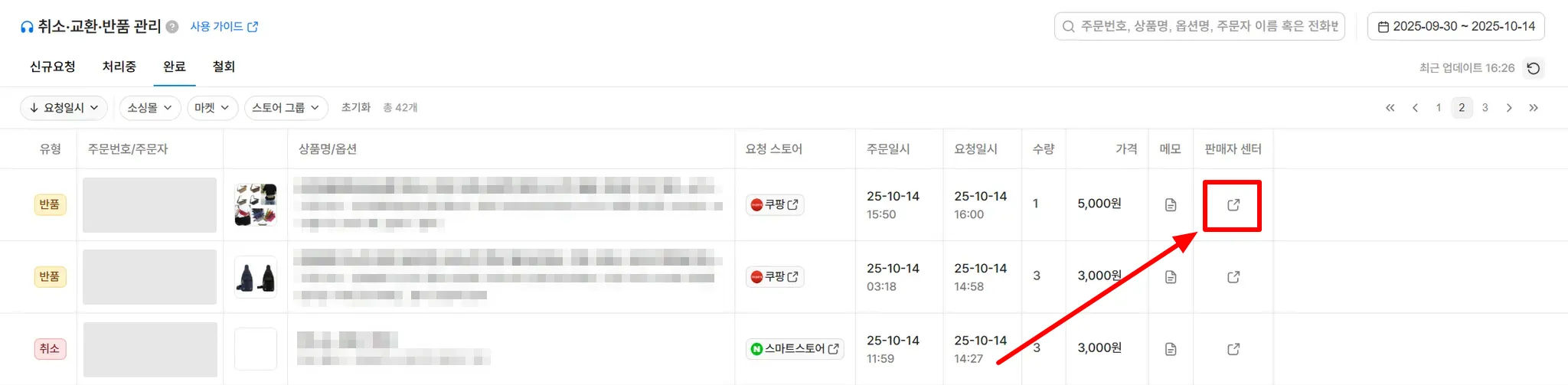 우측의 판매자센터 버튼 클릭 시, 각 오픈마켓의 취소/교환/반품 처리 화면으로 이동합니다.