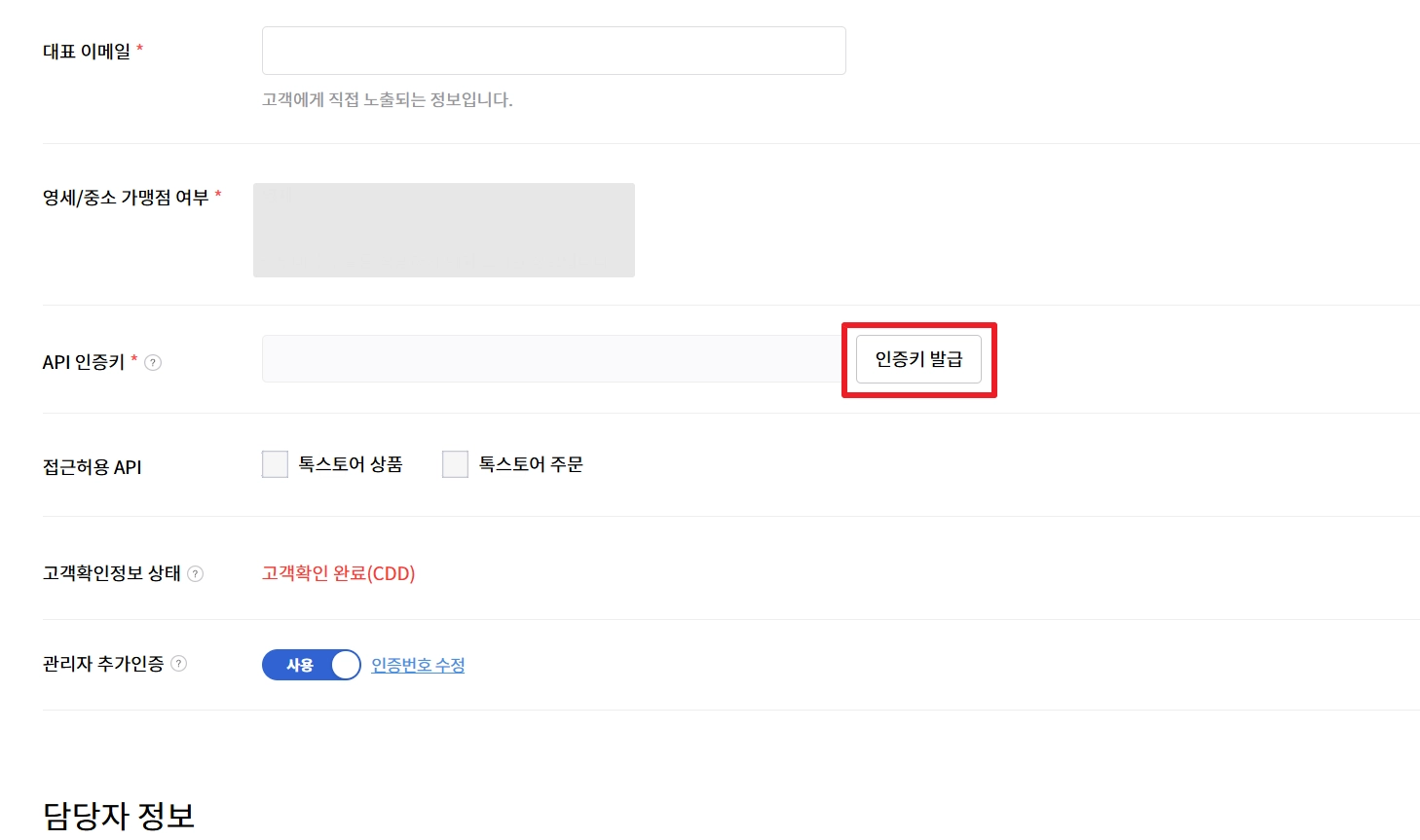 ‘판매채널 정보’ 영역 중간의 ‘API 인증키’에서 인증키 발급 버튼을 클릭해 주세요.