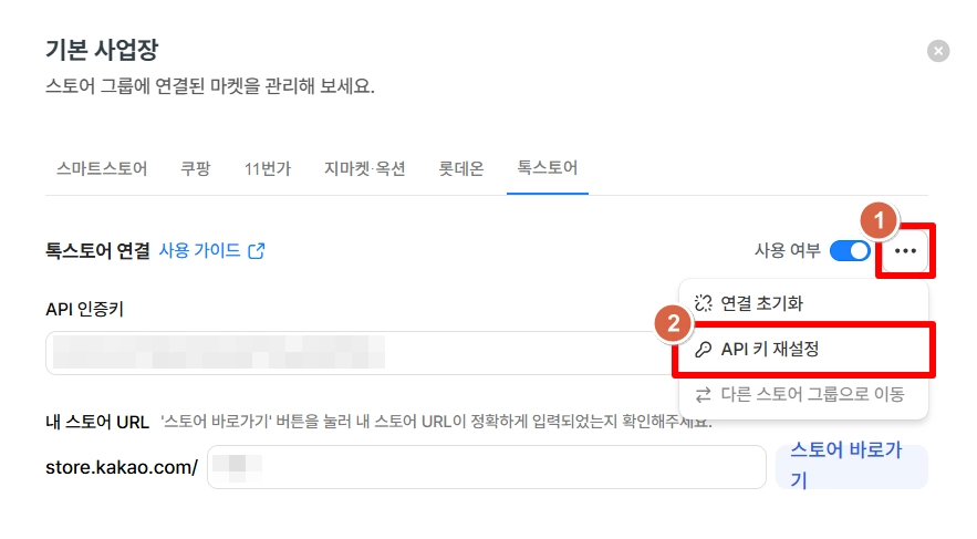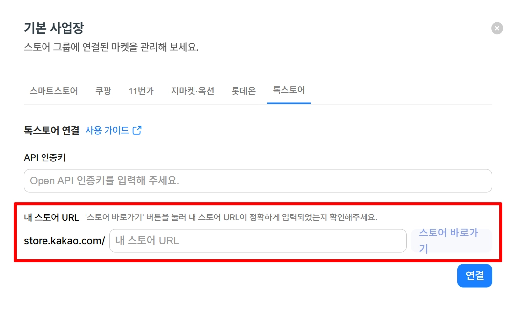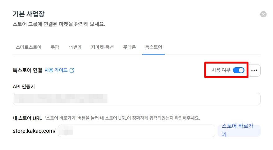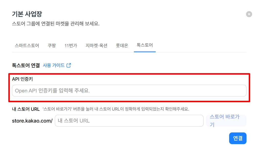 API 인증키 항목에 톡스토어 판매자센터에서 발급 받은 API 인증키를 입력해 주세요.