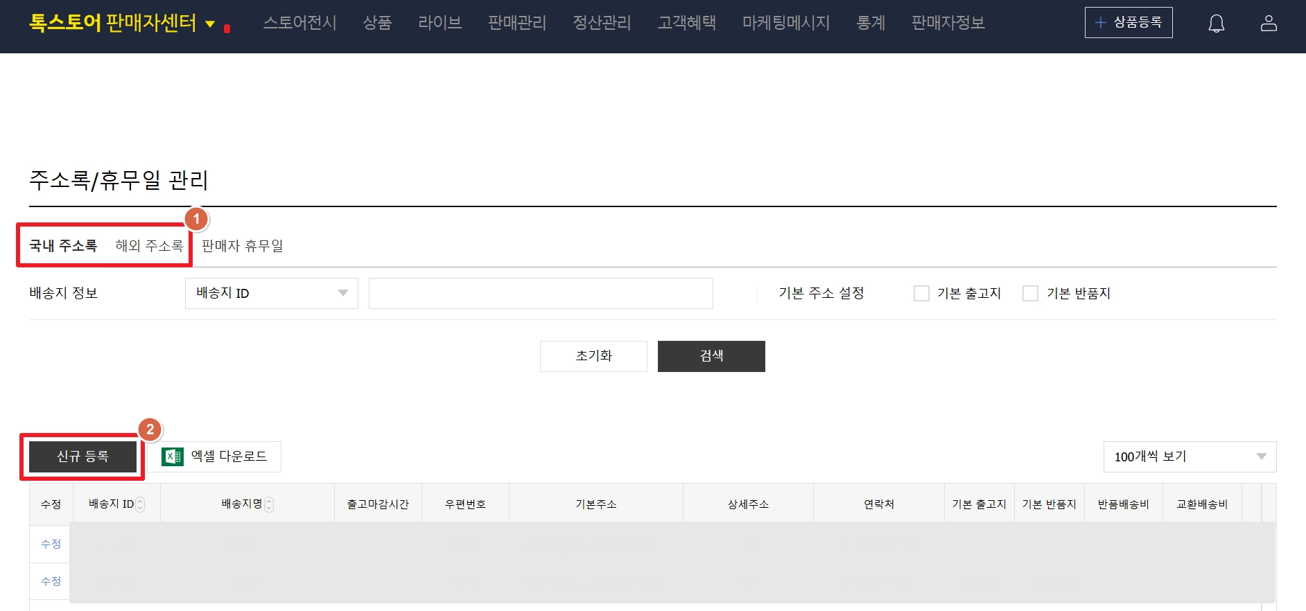 출고지 입력이 완료되었다면, 국내 주소록 영역을 클릭하고, 동일하게 신규 등록 버튼을 클릭하여 반품지 주소도 설정해 주세요.