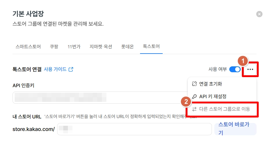 다른 사업자로 마켓 계정을 이동시키면, 기존 사업자의 해당 마켓 연결 설정은 사라져요.