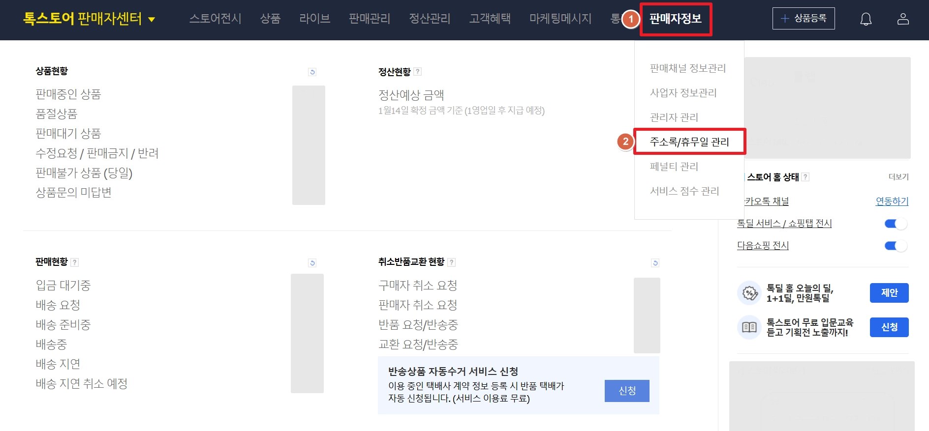 톡스토어 판매자 센터에서 판매자정보 > 주소록/휴무일 관리에 접속해 주세요. (페이지 링크)