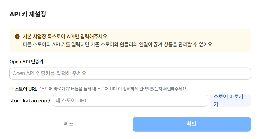 다른 스토어의 API키를 입력하면 기존 스토어 연결이 끊어져 상품을 관리할 수 없으니 유의해 주세요.