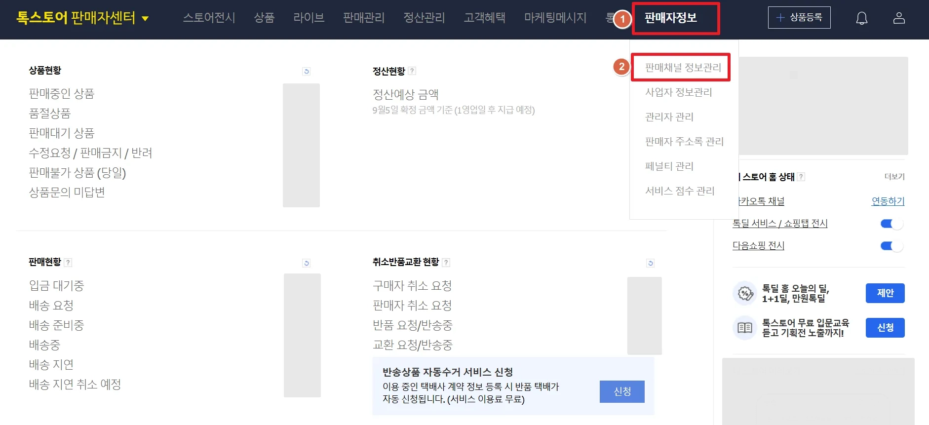 톡스토어 판매자 센터에서 판매자정보 > 판매채널 정보관리에 접속해 주세요. (페이지 링크)