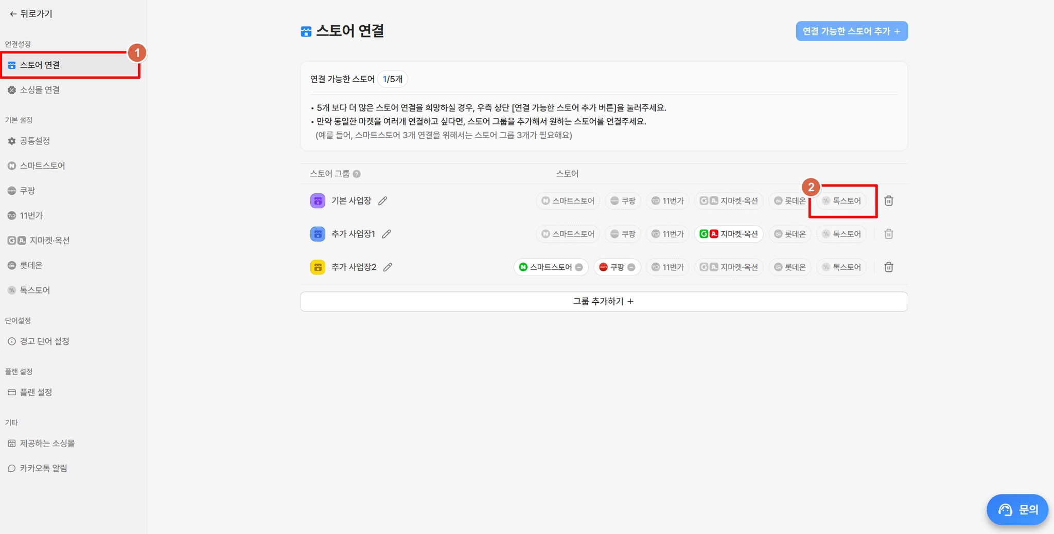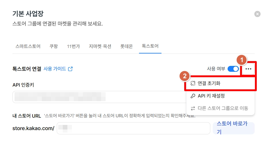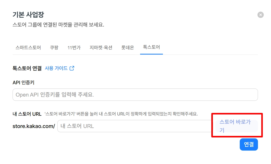 연결설정 > 스토어 연결 메뉴에 접속하여, 스토어 > 톡스토어를 클릭해주세요.