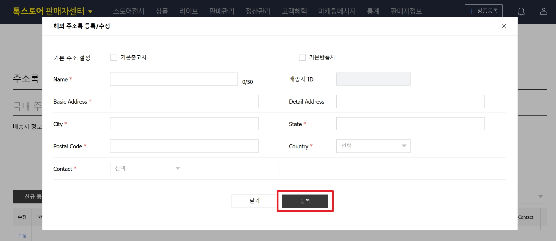 출고지 주소 정보를 입력하고 등록 버튼을 클릭해 주세요.