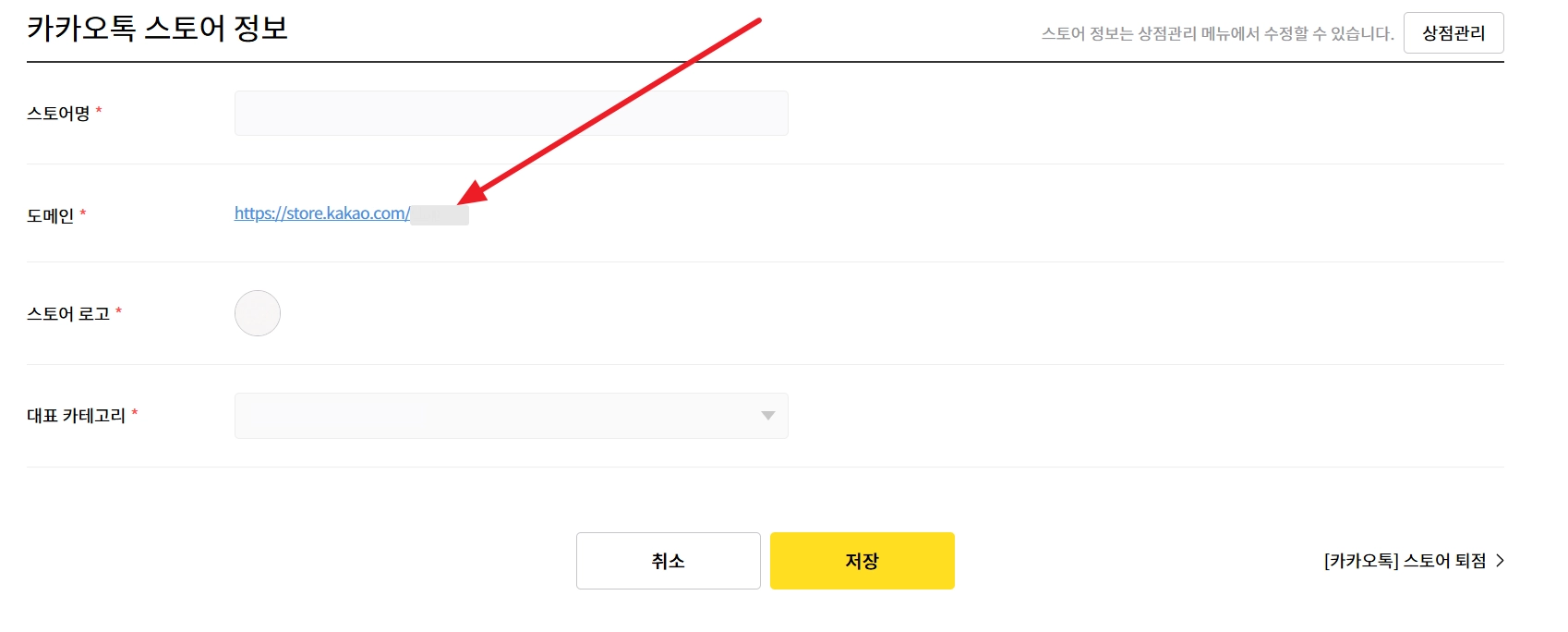 최하단의 ‘카카오톡 스토어 정보’ 영역에서 ‘도메인’이 무엇인지 확인해 주세요.