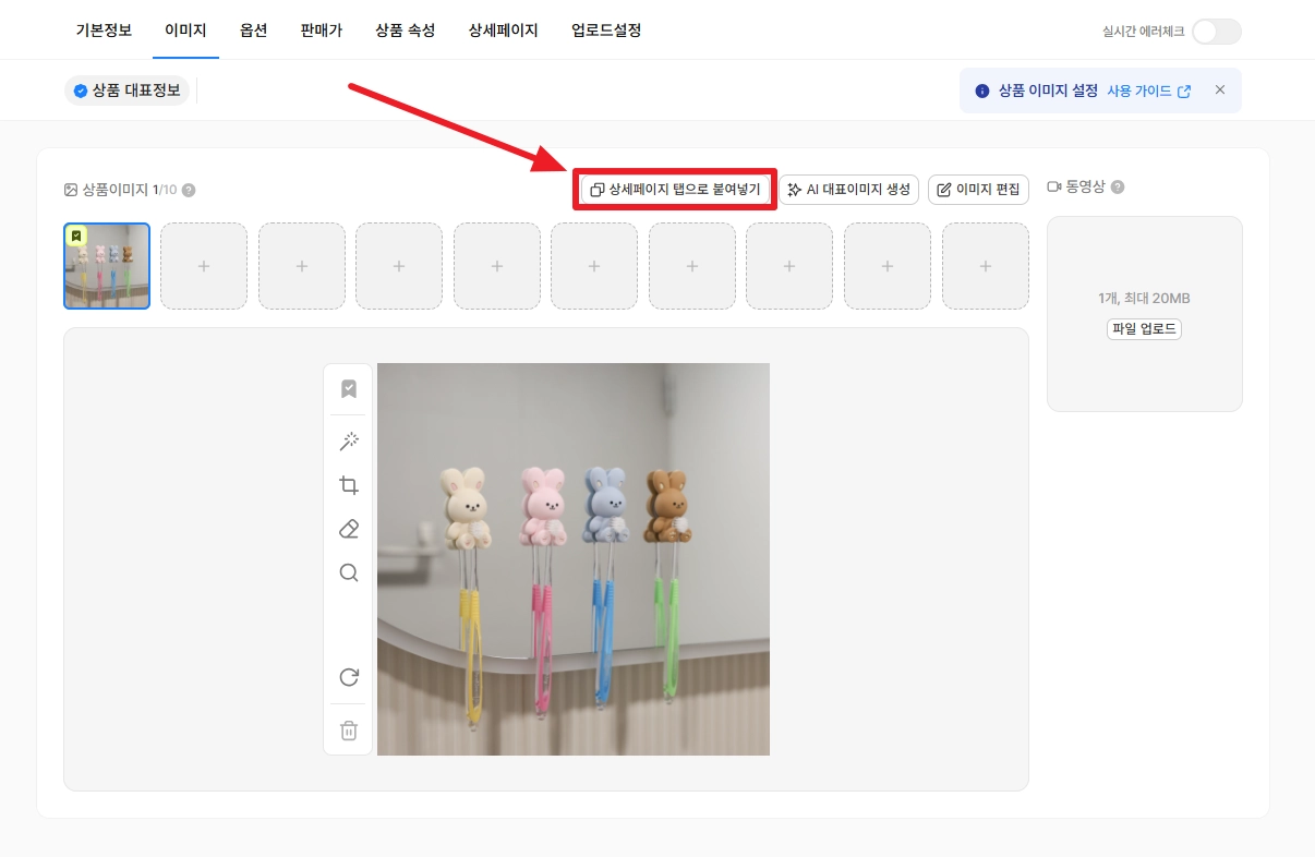 상세페이지 탭으로 붙여넣기 버튼을 클릭하여, 이미지 탭의 모든 이미지를 상세페이지 탭에 붙여넣기 할 수 있어요.