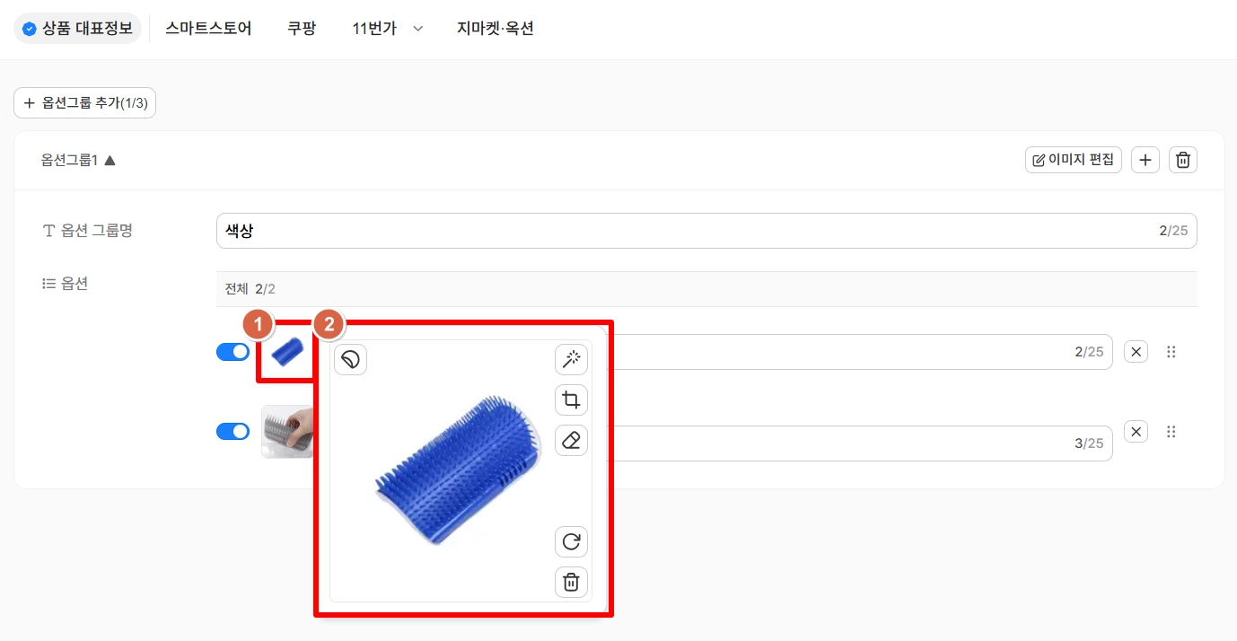 큰 옵션 이미지 영역에서 간단한 이미지 편집 및 옵션 이미지 삭제가 가능해요.