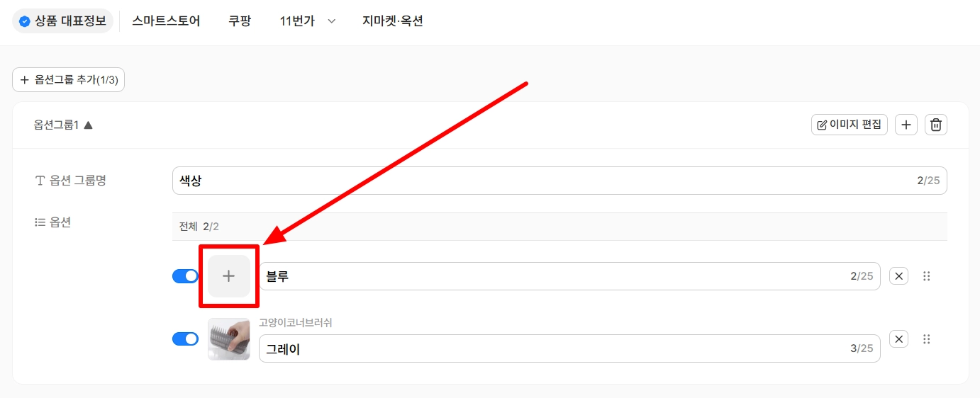옵션그룹 추가 버튼으로 새로운 옵션그룹을 추가할 수 있어요.
