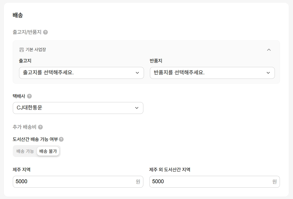 도서산간 배송이 가능하다면, 배송 가능을 선택하고, 도서산간과 제주 지역의 추가 배송비 금액을 설정해 주세요.