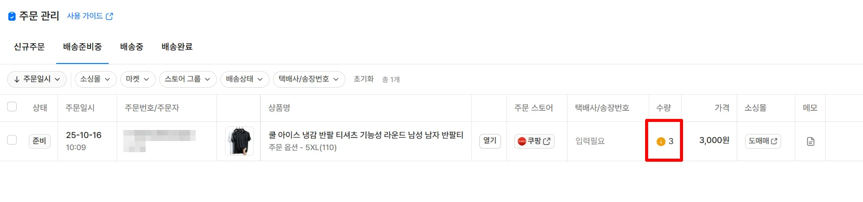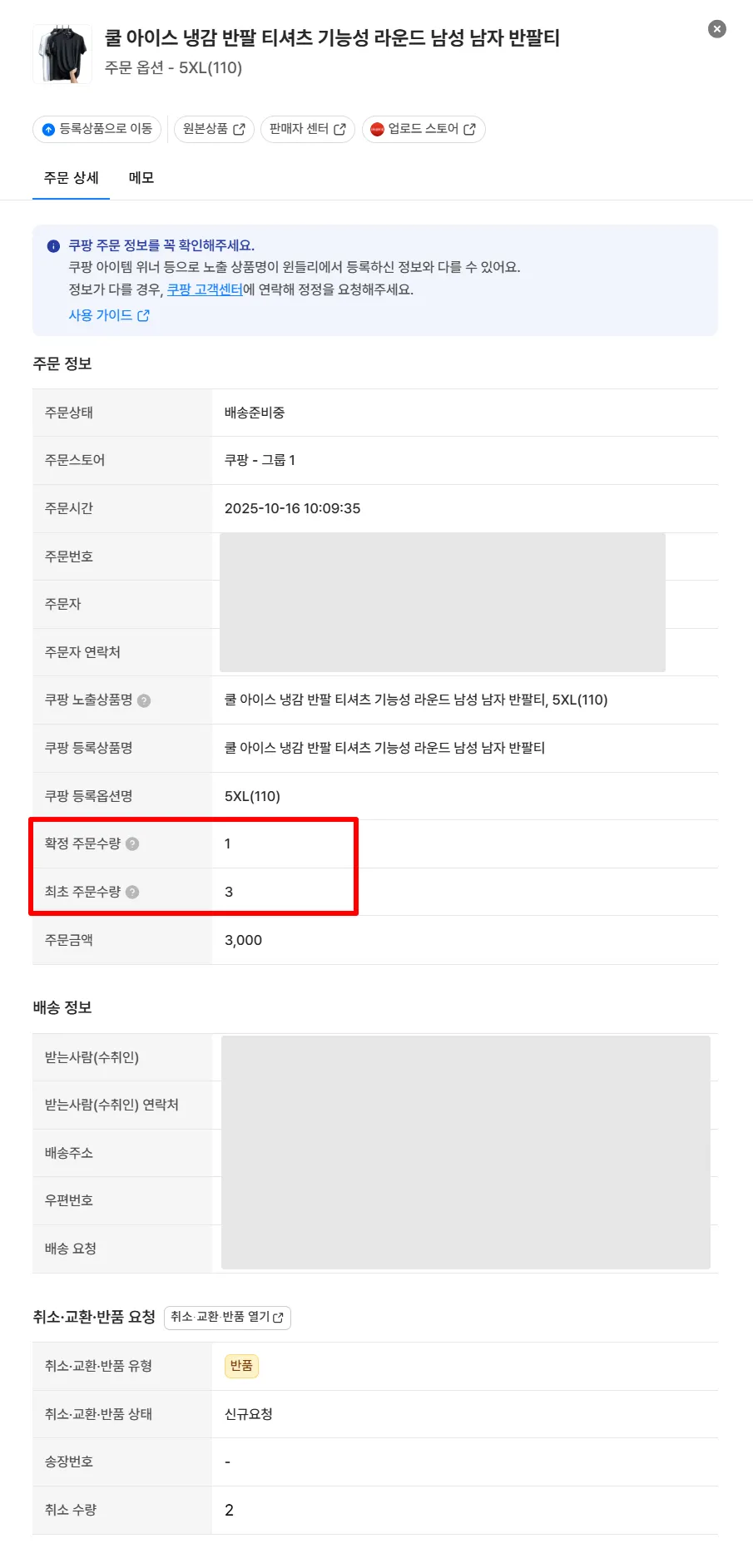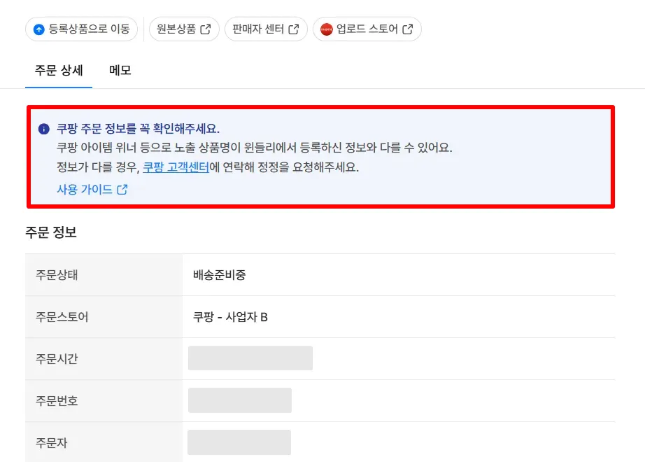 쿠팡 주문 건의 경우, 쿠팡 노출상품명쿠팡 등록상품명을 확인해 주세요.