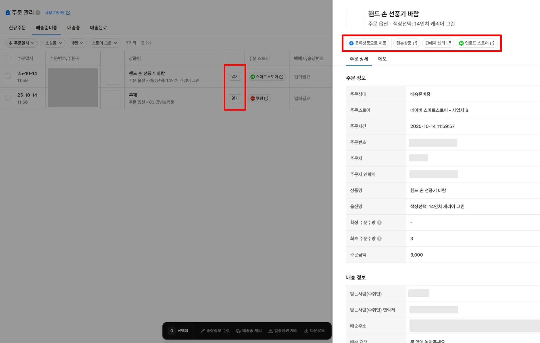 주문 상세 우측 상단 버튼을 클릭하여 등록상품으로 이동, 원본 상품, 판매자센터, 업로드 스토여로 이동이 가능해요.