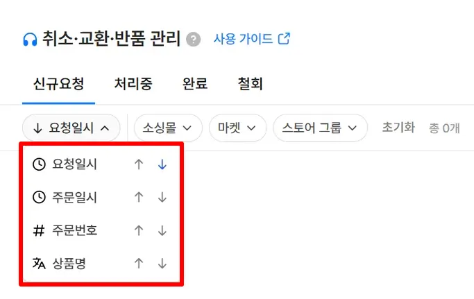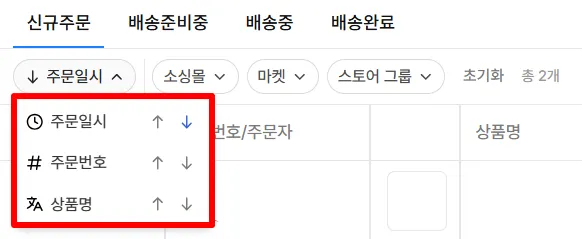 주문일시, 주문번호, 상품명: 주문일시, 주문번호, 상품명 기준 오름차순 또는 내림차순으로 주문을 조회할 수 있어요.