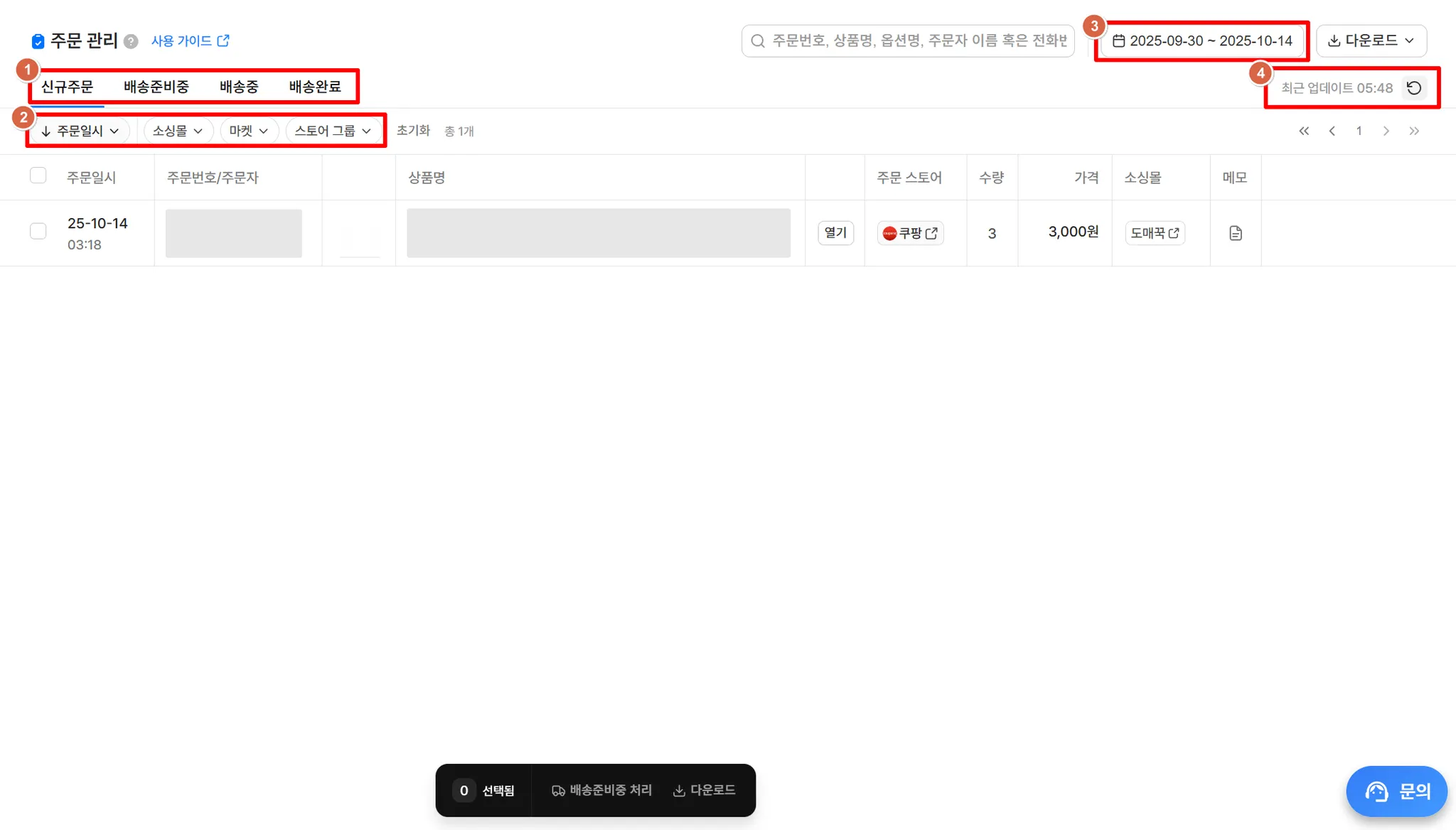 주문조회 시간 및 새로고침: 주문조회를 한 시간을 확인할 수 있고, 새로고침 아이콘을 클릭하면 최신 데이터로 조회됩니다.