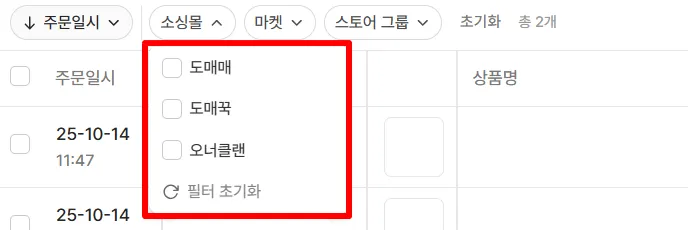 소싱몰: 특정 소싱몰 주문만 보고 싶다면 해당 소싱몰만 선택 ()해 주세요.