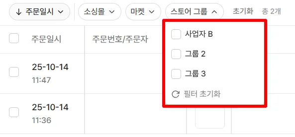 스토어 그룹: 윈들리 설정 → 연결설정 → 스토어 연결에 등록된 스토어 그룹별로 `주문을 조회할 수 있어요. 특정 스토어 그룹 주문만 보고 싶다면 해당 스토어 그룹만 선택 ()해 주세요.