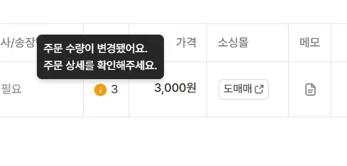 주문 후 취소로 인해 수량이 변경된 경우, 주문 상세에서 이를 알려 드려요. 취소 수량을 제외한 내용은 ‘확정 주문수량’으로 보여 드립니다.