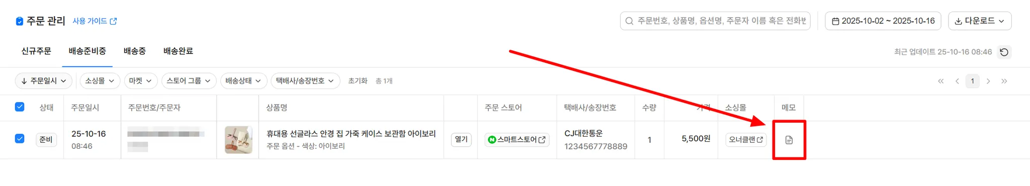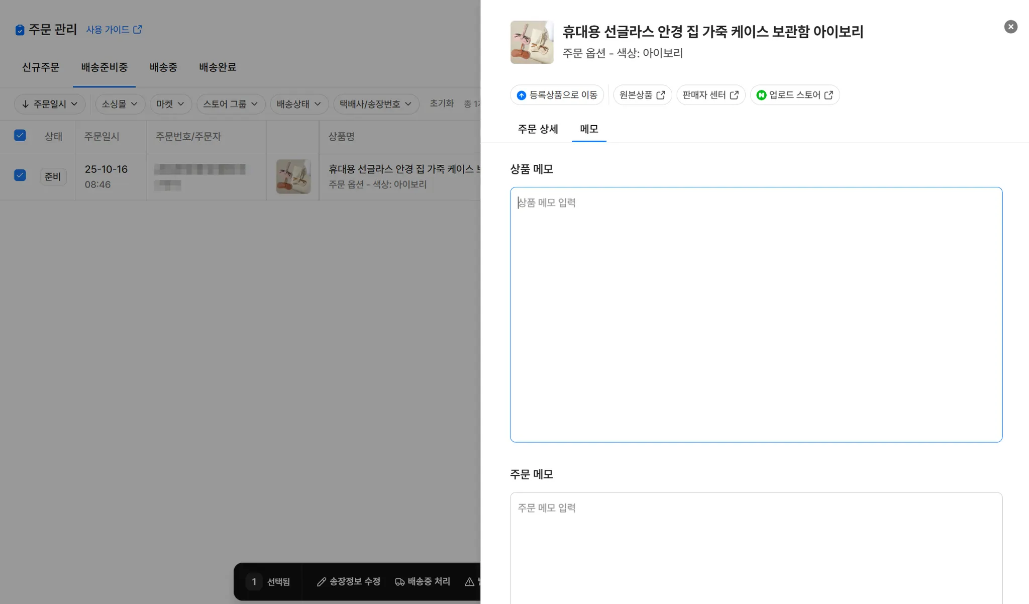 상품 메모가 있는 상품이라면 아래와 같이 상품 메모도 동시에 확인 가능하여, 효율적으로 작업을 하실 수 있어요.