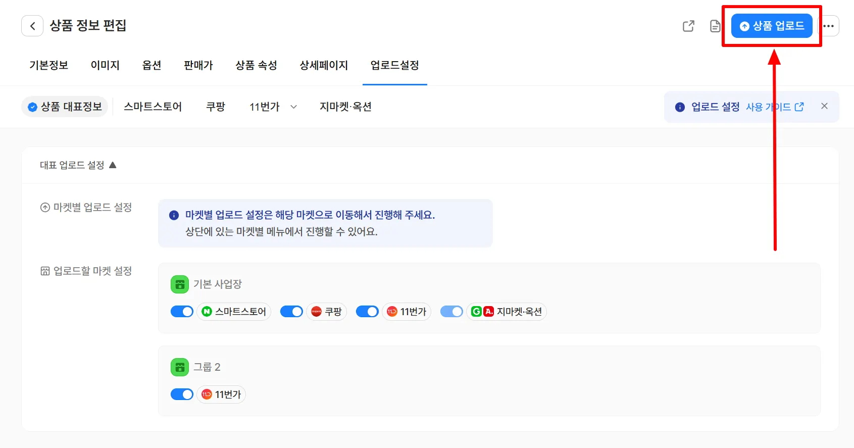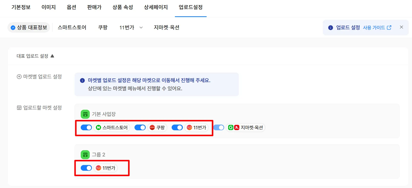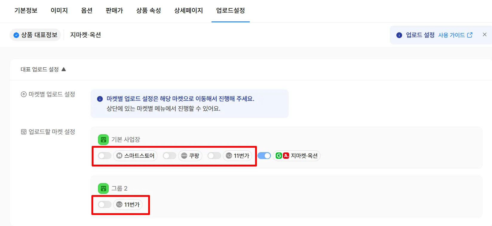 업로드 설정 탭에서 추가 업로드할 마켓의 스위치를 켜주세요.