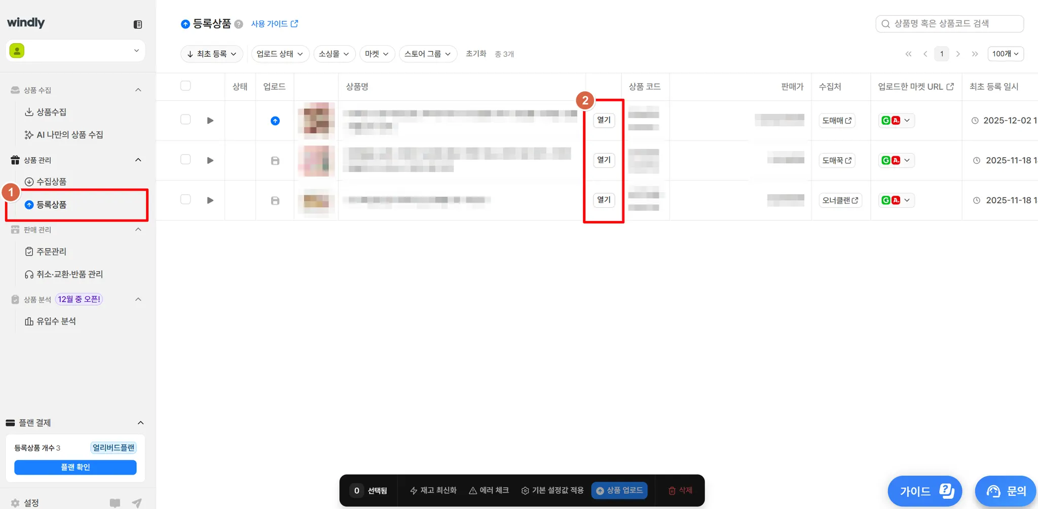 상품관리 > 등록상품 메뉴로 이동하고 추가 업로드할 상품의 [열기] 버튼을 클릭해 주세요.