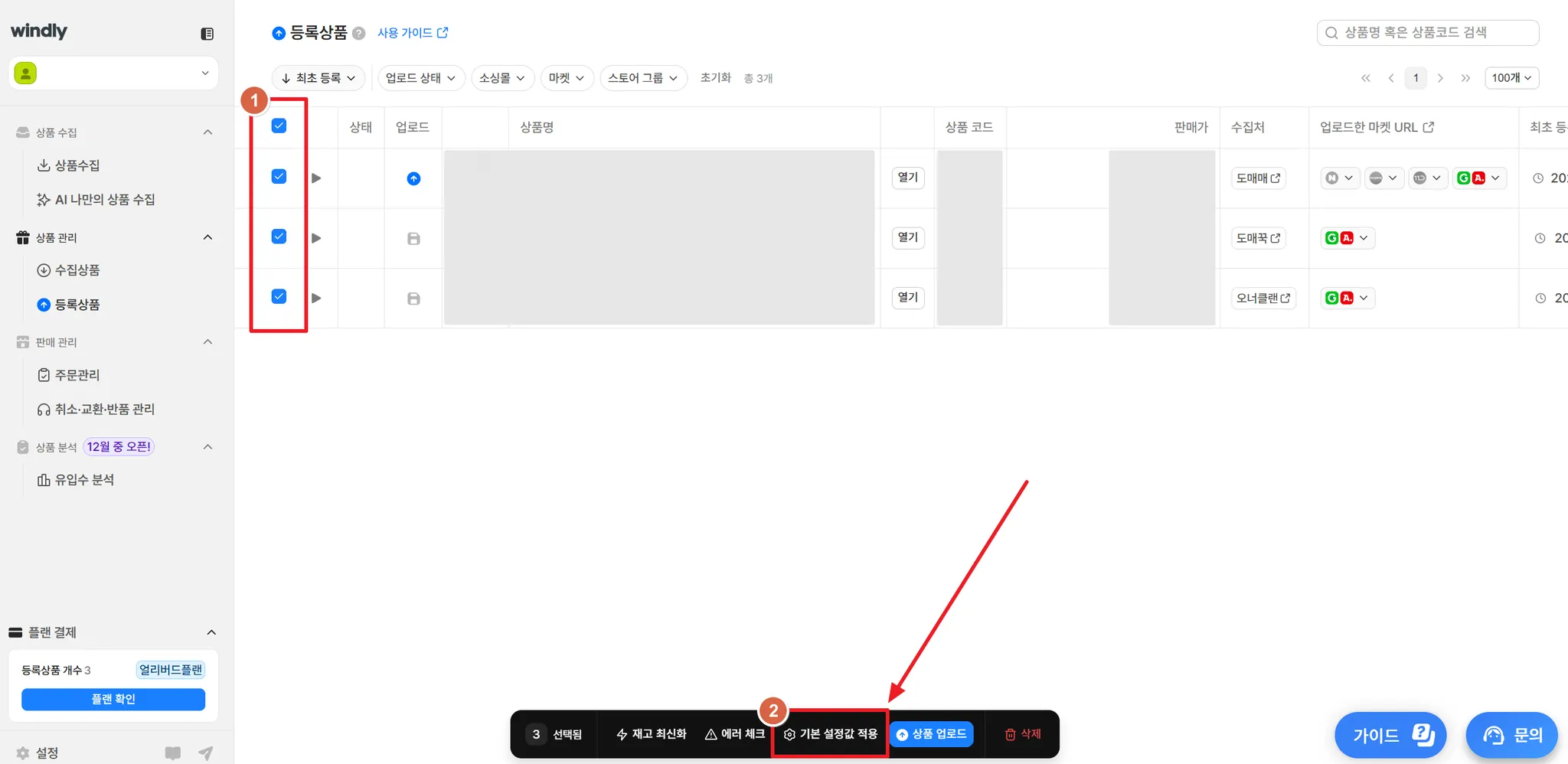 등록상품의 일부 항목을 윈들리 좌측 메뉴 기본설정에 있는 값으로 일괄 적용할 수 있어요.