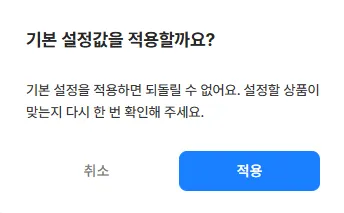 기본 설정값 적용 안내 메시지를 확인한 후, 적용 버튼을 클릭해주세요.